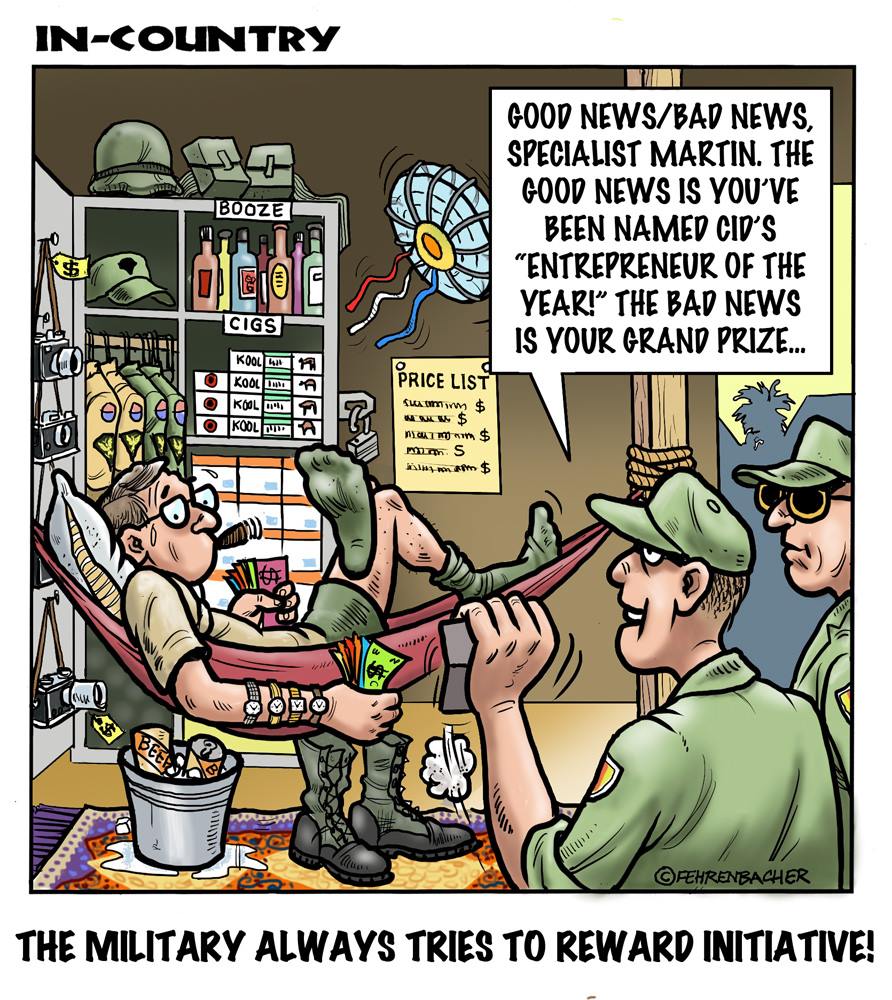 Phil enlisted in the Army in 1965 where he served for years in Vietnam. He became a graphic designer and has worked for the state of Oregon for 26 years. He retired in 2003 and started the Cartoon "In-Country". The cartoons reflect his experiences during his tour of duty in South Vietnam.
